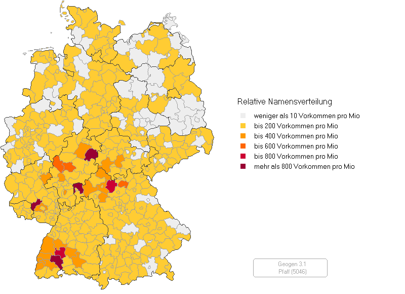 In GeoGen wurden 5046 Einträge gefunden* und in 390 verschiedenen Landkreisen lokalisiert. Hochgerechnet auf die Gesamtbevölkerung sind etwa 13456 Namensträger zu erwarten. Damit tritt der Name überdurchschnittlich häufig auf. Pfaff belegt den 525. Platz der häufigsten Namen.