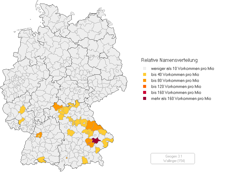 Wenn man die Bevölkerungsdichte verrechnet, findet man die meisten Wallingers in/im Landkreis Dingolfing-Landau (BY), nämlich 195 Anschlüsse pro Million Einwohner. Fast verschwunden ist die Familie aus Kreisfreie Stadt Hamburg, hier treten pro Million Einwohner die wenigsten auf.