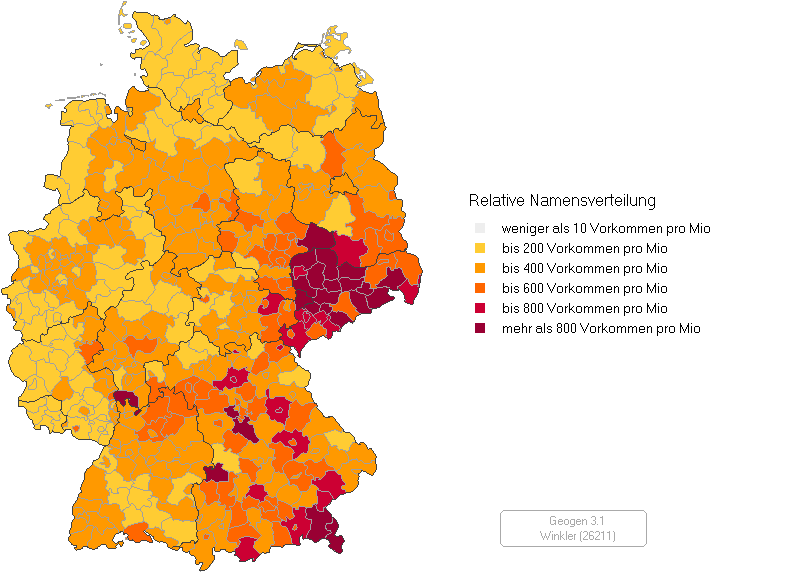 In GeoGen wurden 26211 Einträge gefunden* und in 439 verschiedenen Landkreisen lokalisiert. Hochgerechnet auf die Gesamtbevölkerung sind etwa 69896 Namensträger zu erwarten. Damit tritt der Name überdurchschnittlich häufig auf. Winkler belegt den 57. Platz der häufigsten Namen.